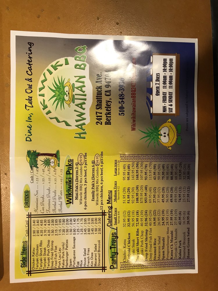 Introducing the flavorful world of Wikiwiki Hawaiian BBQ located in Berkeley, CA. This fast-food gem offers a unique fusion of Hawaiian and Barbeque cuisine, perfect for a casual yet classy dining experience. From Portuguese Sausages & Eggs to Mini Short Ribs, the menu is bursting with tantalizing options for beef and seafood lovers. Dishes like the Grilled Garlic Fish Plate and the Chicken Mix Plate are highly recommended by satisfied customers. The generous portions and affordable prices make it easy to share a meal or indulge in multiple options. With excellent marination and a focus on quality ingredients, Wikiwiki Hawaiian BBQ promises a dining experience that will leave you feeling comforted, nourished, and coming back for more. Choose Wikiwiki for a taste of Hawaii right in your neighborhood.